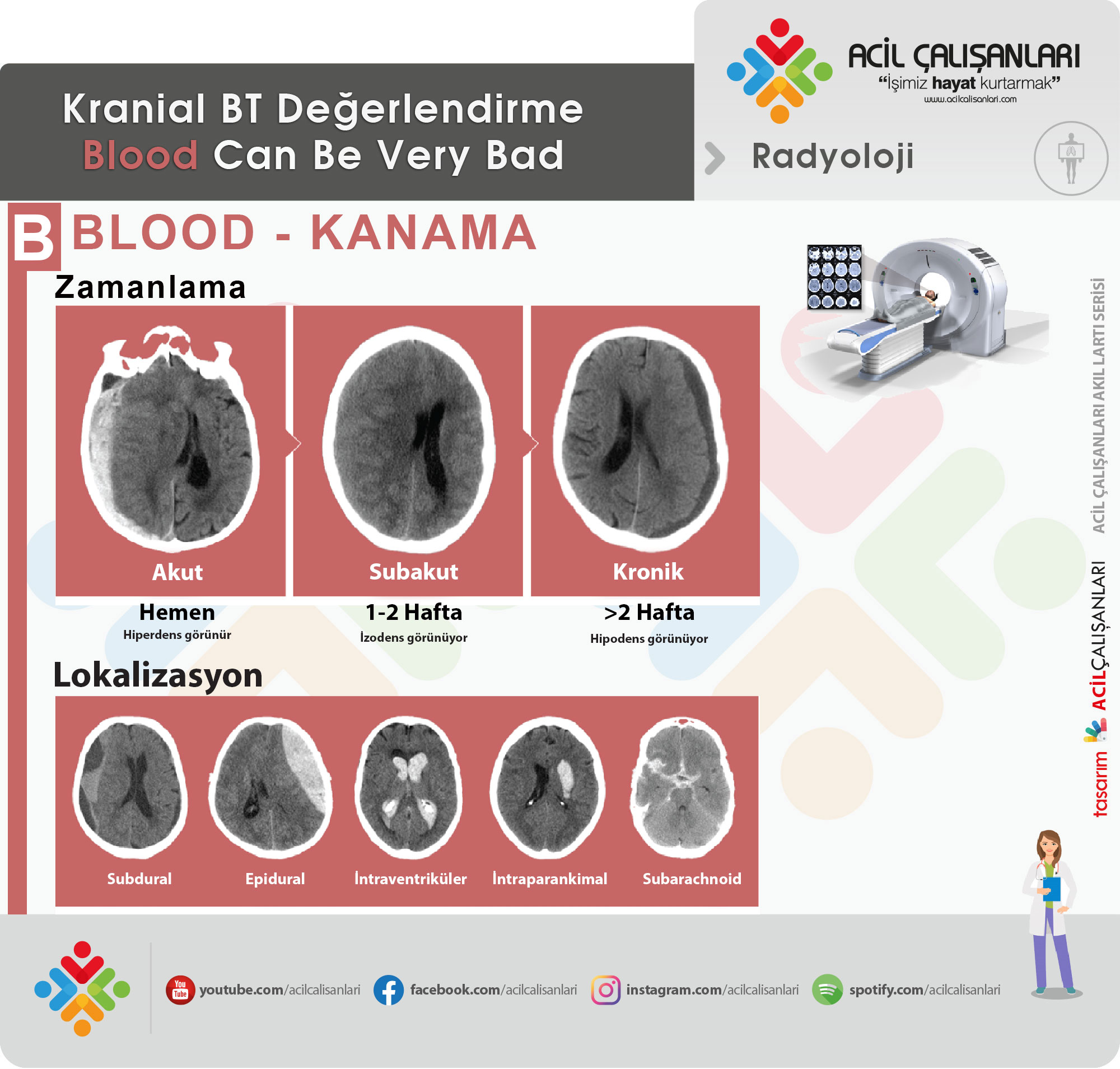 Travmatik ya da spontan meydana gelen intrakraniyal kanamaların tanınması için kontrast madde olmadan beyin BT görüntülemesi yapılmalıdır. Akut dönemde kanamanın dansitesi parankim dansitesinden daha yüksektir.