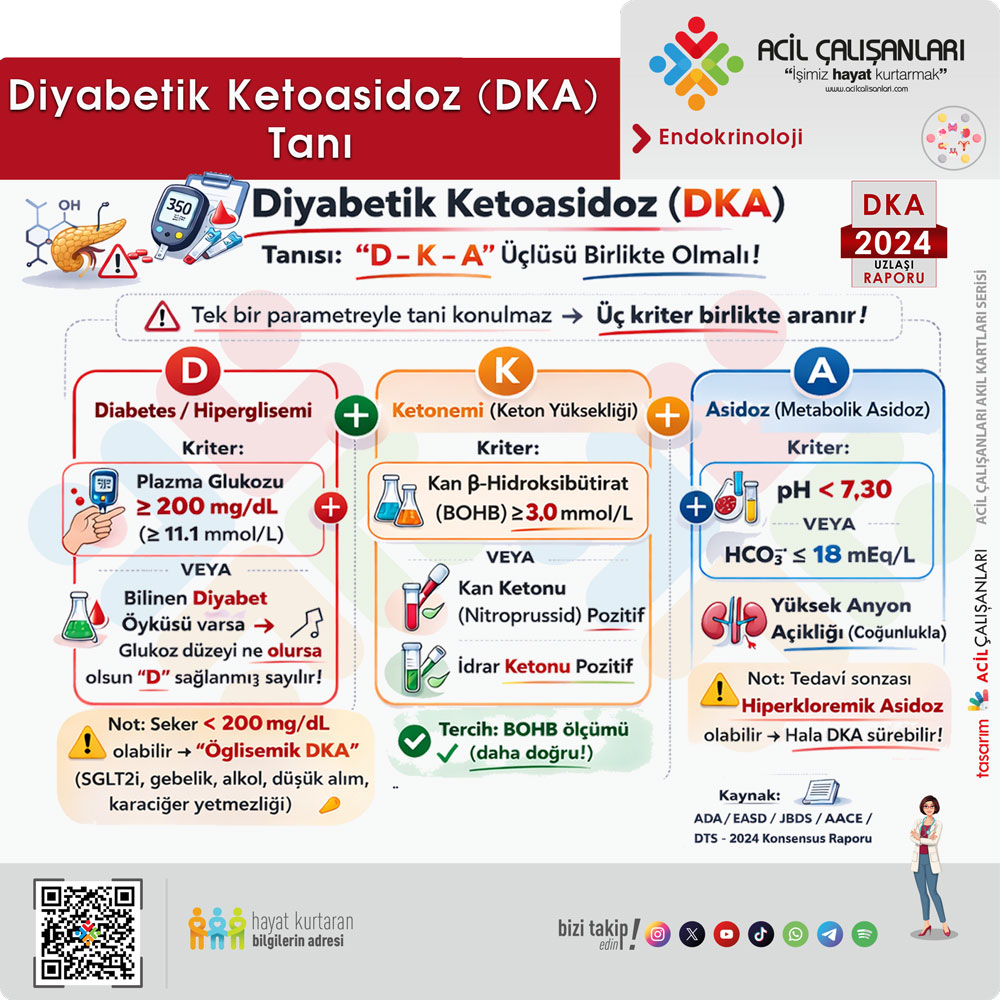 Kılavuz, DKA tanısını tek bir laboratuvar parametresine indirgememeyi özellikle vurgular: Tanı için hiperglisemi/diyabet varlığı + keton yüksekliği + metabolik asidoz birlikte bulunmalıdır.