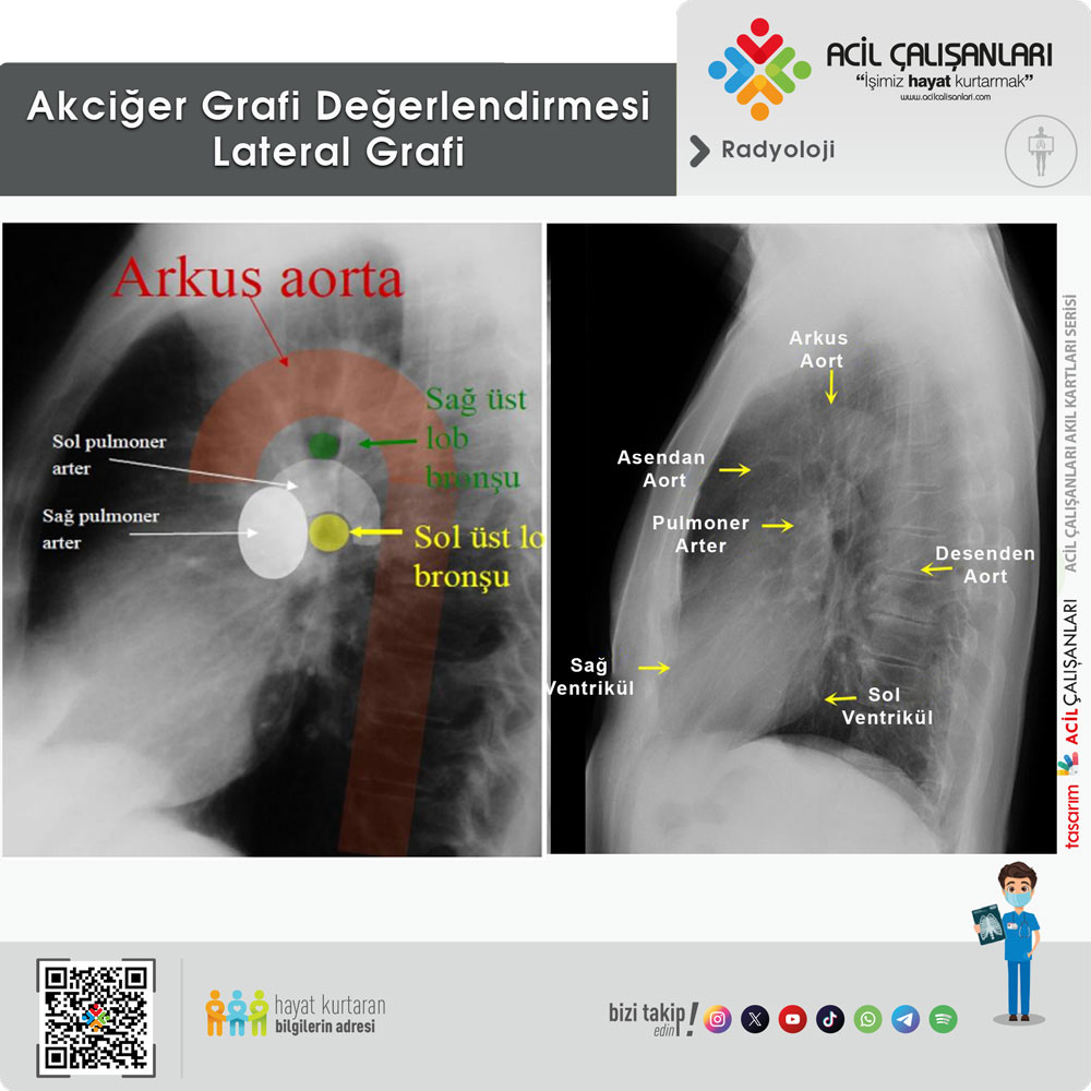 • Lateral: PA grafiyi tamamlayıcıdır. Lezyonun ön–arka yerleşimini ve retrosternal, retrokardiyak alanları değerlendirmede kullanılır.