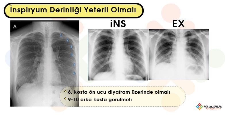 PA akciğer grafisi tam inspiryumda çekilmelidir. Uygun inspiryumda diyafram 8–10. posterior kosta ya da 5–6. anterior kosta seviyesinde olmalıdır. Yetersiz inspiryum veya ekspirasyonda çekilen grafiler parankim değerlendirmesinde hatalara neden olabilir ve tekrar çekim gerekebilir.