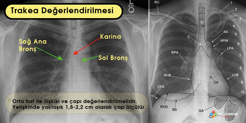 Akciğer grafisi değerlendirilirken yapılar yukarıdan aşağıya doğru sistematik olarak incelenir. Önce hava yollarına bakılır. Trakea orta hatta mı, sağa veya sola deviye mi değerlendirilir. Lümen açık mı, daralma veya bası var mı kontrol edilir. Ana bronşların yönelimi ve açıklığı gözden geçirilir.