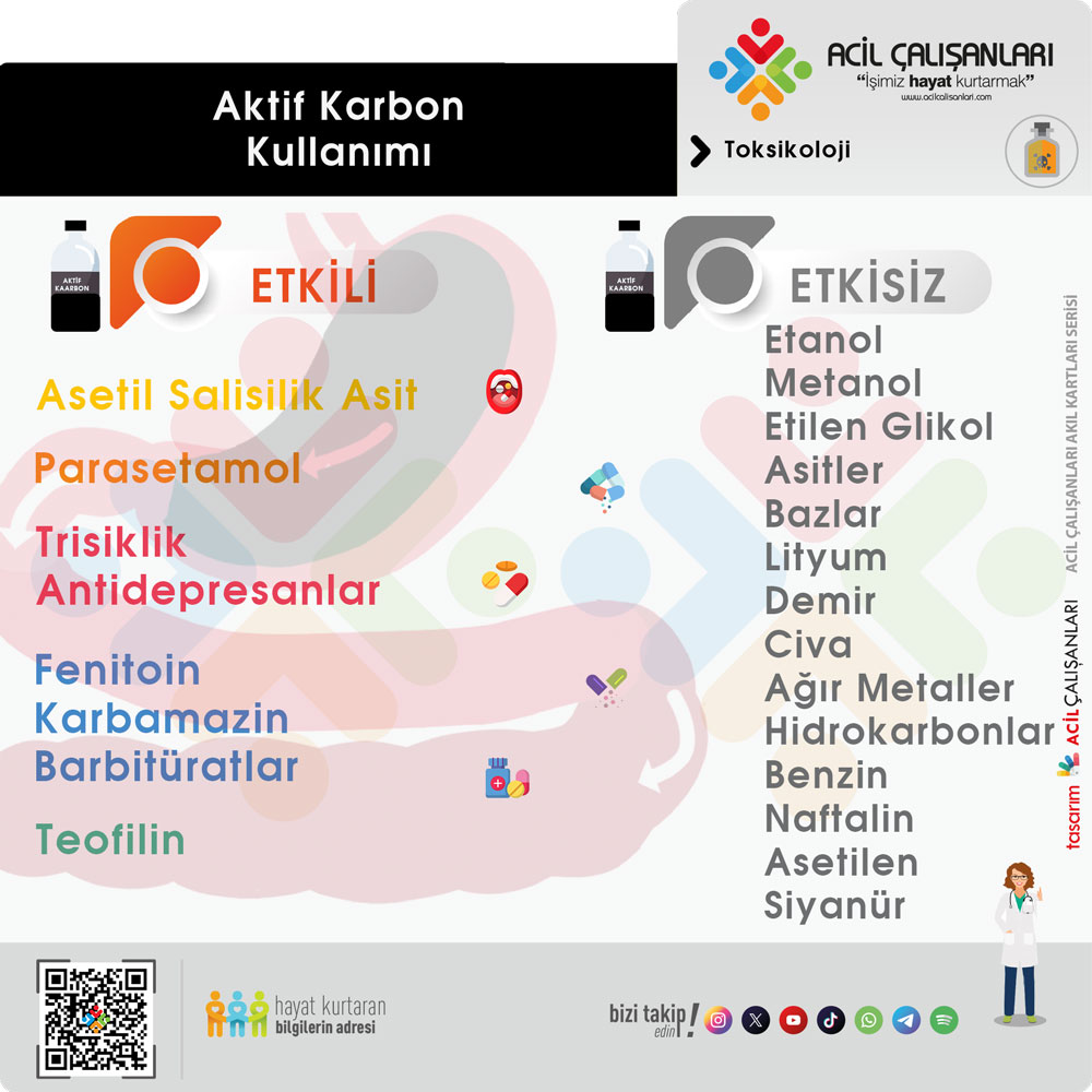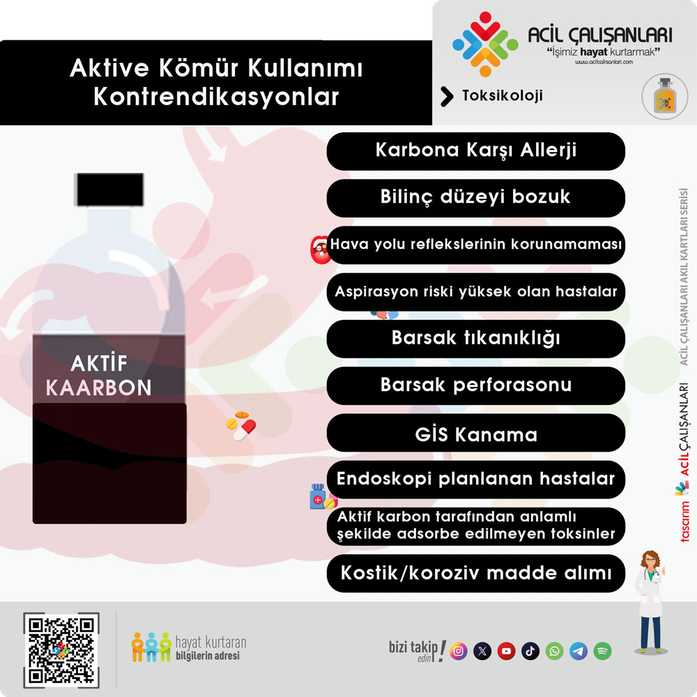 - Bilinç düzeyi baskılanmış hastalarda, aktif karbonun sağlayacağı terapötik fayda ile entübasyon yoluyla havayolu güvenliği sağlanmasının risk–fayda dengesi dikkatle değerlendirilmelidir.