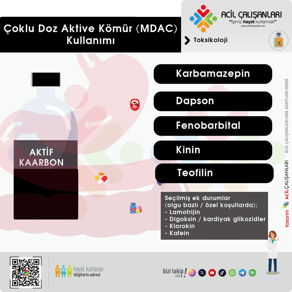 🔎 Not: MDAC genellikle hayatı tehdit eden, enterohepatik dolaşıma giren veya uzun eliminasyon yarı ömrü / geç emilim özellikleri olan maddelerde düşünülür. Her olguda havayolu güvenliği ve kontrendikasyonlar mutlaka değerlendirilmelidir.