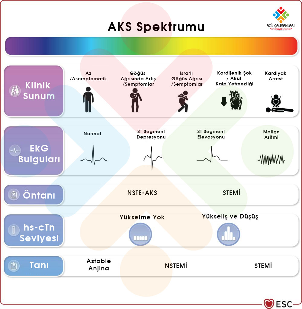 Akut Koroner Sendromlar; 12 derivasyonlu EKG’de ya da kardiyak troponin seviyesinde değişiklik olsun ya da olmasın, klinik semptom veya bulguların yakın zamanda değişiklik olan bir dizi durumu kapsar. AKS şüphesi olan hastalar nihai tanı olarak akut miyokard enfarktüsü(AMI) ya da Unstabil Anjina (UA) tanısını alırlar.