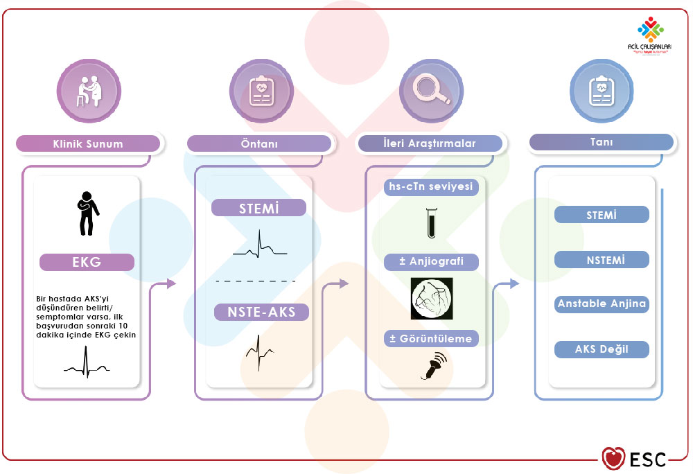 AKS şüphesiyle başvuran hastalar başvuru anında ilk olarak EKG çekilerek sınıflandırılırlar. Ardından kardiyak troponin seviyelerinde yükselme varlığı ya da yokluğuna göre yeniden sınıflandırılırlar. EKG ve troponin seviyeleri hastanın başvuru anında tedavi stratrejisinin belirlenmesine katkıda bulunur. AKS şüphesi olan hastanın nihai tanısını alana kadar geçen süreç Figüre 3’de gösterilmiştir.