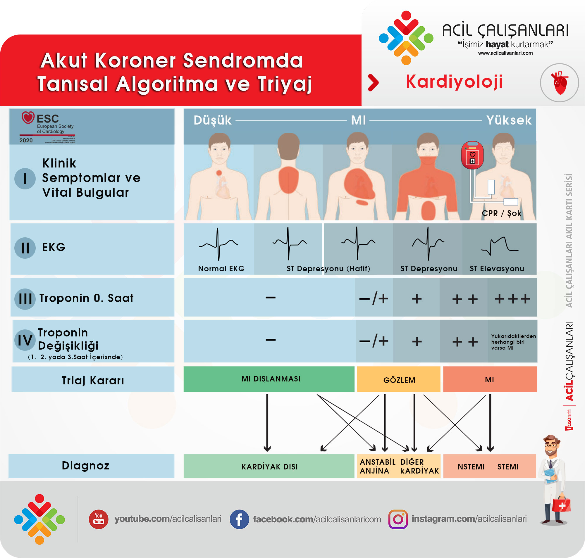 2020 ESC ST Yükselmesi Olmayan Miyokard İnfarktüsü (NSTMI) Klavuzunda alınan karta bizlere tanısal bir algoritma sunmaktadır.
