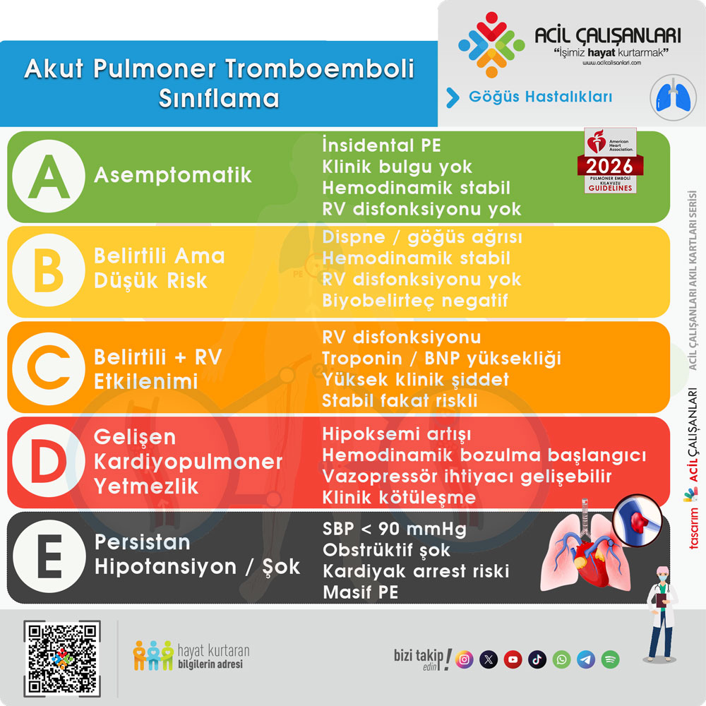 Tanı doğrulandıktan sonra hastalar AHA/ACC 2026 kılavuzunda tanımlanan A–E akut pulmoner emboli klinik kategorilerine göre sınıflandırılır ve bu sınıflama risk düzeyinin belirlenmesi, yatış kararı ve uygun tedavi stratejisinin seçilmesine rehberlik eder.