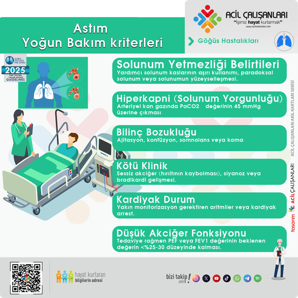 Acil serviste takip edilen astım hastalarında aşağıdaki bulgulardan herhangi birinin varlığı, yoğun bakım ihtiyacı ve yakın monitorizasyon gerekliliğini gösterir:Tedaviye Yanıtsızlık: Uygun dozda SABA, İpratropium ve sistemik steroid tedavisine rağmen klinik durumun kötüleşmesi veya düzelmemesi.