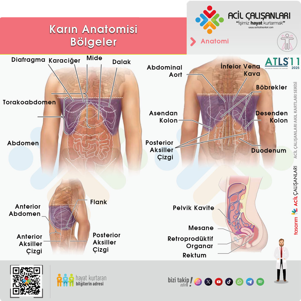 Abdomen, travmaya bağlı yaralanmaların sık görüldüğü, çok sayıda hayati organı barındıran kompleks bir anatomik bölgedir. Üst sınırını diyafram, alt sınırını pelvis oluşturur ve anatomik olarak intraperitoneal, retroperitoneal ve pelvik yapılar olmak üzere üç ana bölgeye ayrılarak değerlendirilir. Bu ayrım, travma sonrası yaralanma paterni ve tanısal yaklaşım açısından kritik öneme sahiptir.