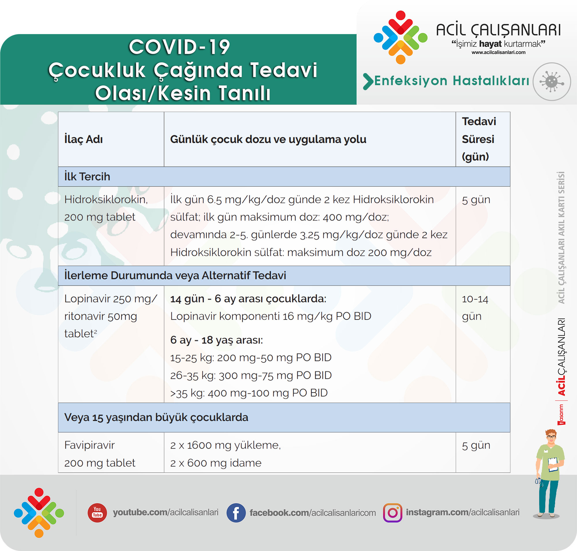Sağlık Bakanlığı Bilim Kurulu tarafından 3 Haziran 2020 tarihinde COVID-19 Çocuk Hasta Yönetimi ve Tedavi rehberi yayınlanmıştır. Bu rehbere göre çocuklarla ilgili COVID-19 enfeksiyonuna yönelik tedaviler ile ilgili, bugün için bilimsel kanıt düzeyi yeterli olan veri bulunmamaktadır. Ayrıca, farklı ülkerden gelen ve ülkemiz çocuk vakalarından elde edilen bilgiler, çocuklarda bugün hala destek tedavi yaklaşımlarının birçok vakada yeterli olduğunu göstermektedir. Bu nedenle çocuklarla ilgili COVID-19 tedavi önerileri erişkin çalışmalarına göre değerlendirilmeli ve çocuk hastanın durumuna göre planlanması önerilmektedir.