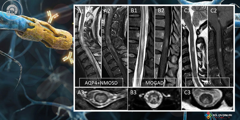 Bu şekil, AQP4+NMOSD, MOGAD ve MS hastalarında görülen miyelit tablolarına ait tipik manyetik rezonans (MR) bulgularını göstermektedir.