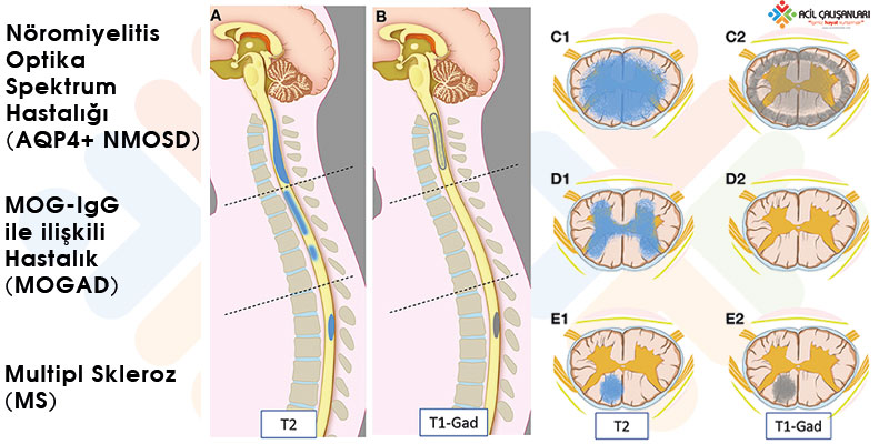 Bu görüntüleme paternleri, NMOSD, MOGAD ve MS ayrımında son derece değerlidir ve acil serviste akut miyelit tablosu ile başvuran hastalarda doğru tanı ve tedavi stratejisinin belirlenmesine yardımcı olur.
