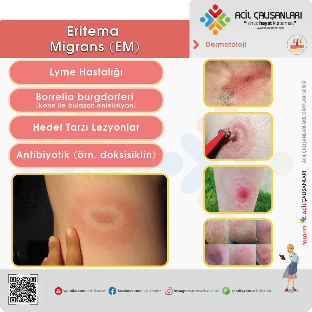 Acil servise başvuran hastalarda özellikle kene teması öyküsü, eşlik eden ateş, halsizlik, baş ağrısı ve miyalji gibi non-spesifik semptomlarla birlikte görülen genişleyen cilt lezyonları varlığında eritema migrans mutlaka akılda tutulmalıdır. Erken dönemde tanı konulması, hastalığın dissemine evrelere ilerlemesini ve nörolojik, kardiyak ya da romatolojik komplikasyonların gelişimini önlemek açısından kritik öneme sahiptir.