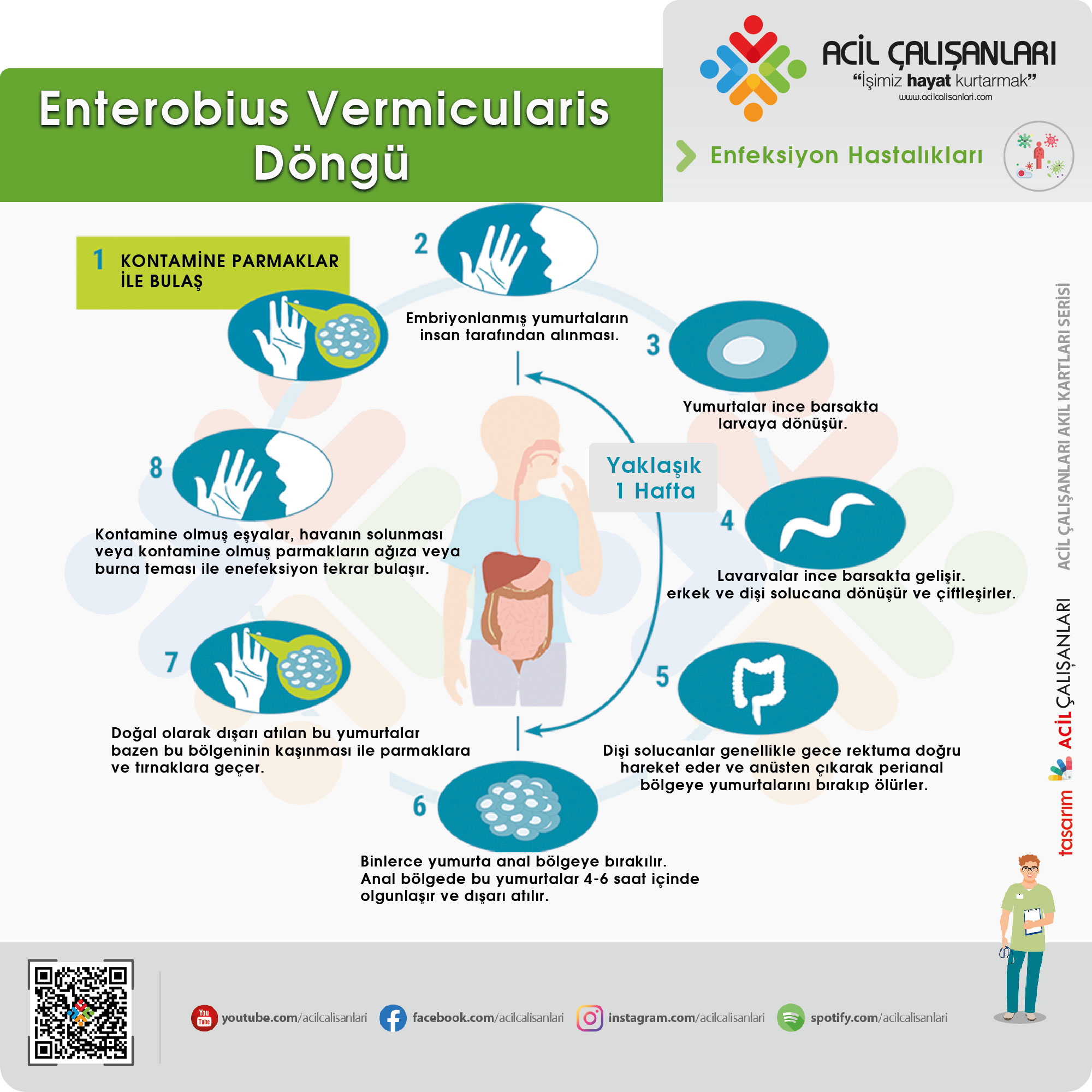 Enterobius vermicularis insana özgü olmakla birlikte öncelikle ileum ve çekumda yaşayan nadiren de ince bağırsağın son kısımları, mide, gastrointestinal sistemden farklı bir bölgede de yaşayabilen bir organizmadır. Enterobius vermicularisin çoğalmasında dişi parazitin yumurtlama özelliği önemlidir. E. vermicularis yumurtaları yutulduktan sonra, ince bağırsakta oluşan yetişkin erkek ve dişi solucanlara dönüşmeleri yaklaşık 1 ila 2 ay sürer . Bunlar ileoçekal alanla sınırlı kaldıklarında genellikle herhangi bir belirtiye neden olmazlar. E. vermikularis bağırsak lümeni içerisinde genellikle serbest bulunur ve bağırsak lümeni içerisindeki gıdalar, mukoza epiteli, kan ve lenf sıvısından beslenir.  Dişi E.vermicularis yumurtlama zamanı geldiğinde genellikle rektuma doğru hareket eder ve anüsten çıkarak perianal bölgeye yumurtalarını bırakır ve ölür. Bu göç kaşıntıya neden olur. Ayrıca yumurtalar anal bölgenin yakınında çatlar ve perianal kaşıntıya ayrıca neden olur. Bu kaşıntı parmakların kirlenmesine yol açar ve yumurtaların yutulmasına (otoenfeksiyon) ve solucanın yaşam döngüsünün yeniden başlamasına neden olur. Bazen larvalar rektuma ve ince bağırsağa tekrar geri döner ve yaşam döngüsüne tejkrar başlar (retro enfeksiyon).