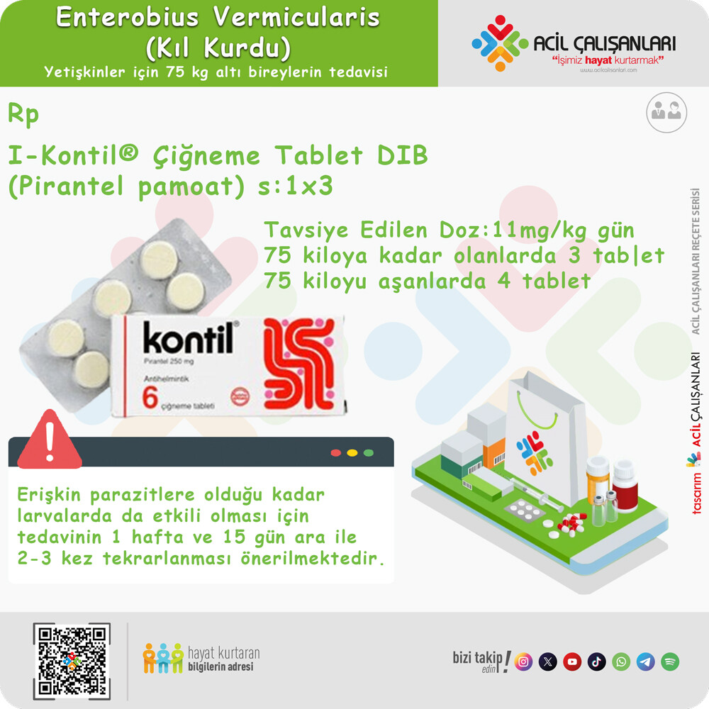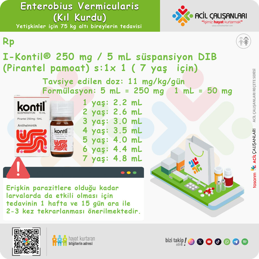 Pyrantel Pamoate (KONTİL®): Amerika Birleşik Devletleri’nde reçetesiz satılmaktadır; 2 hafta arayla verilen maksimum 1 gm’ye kadar 11 mg/kg doz önerilir.