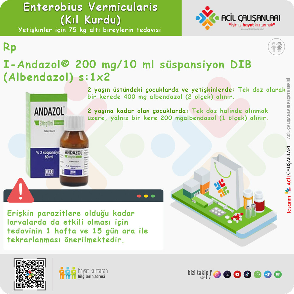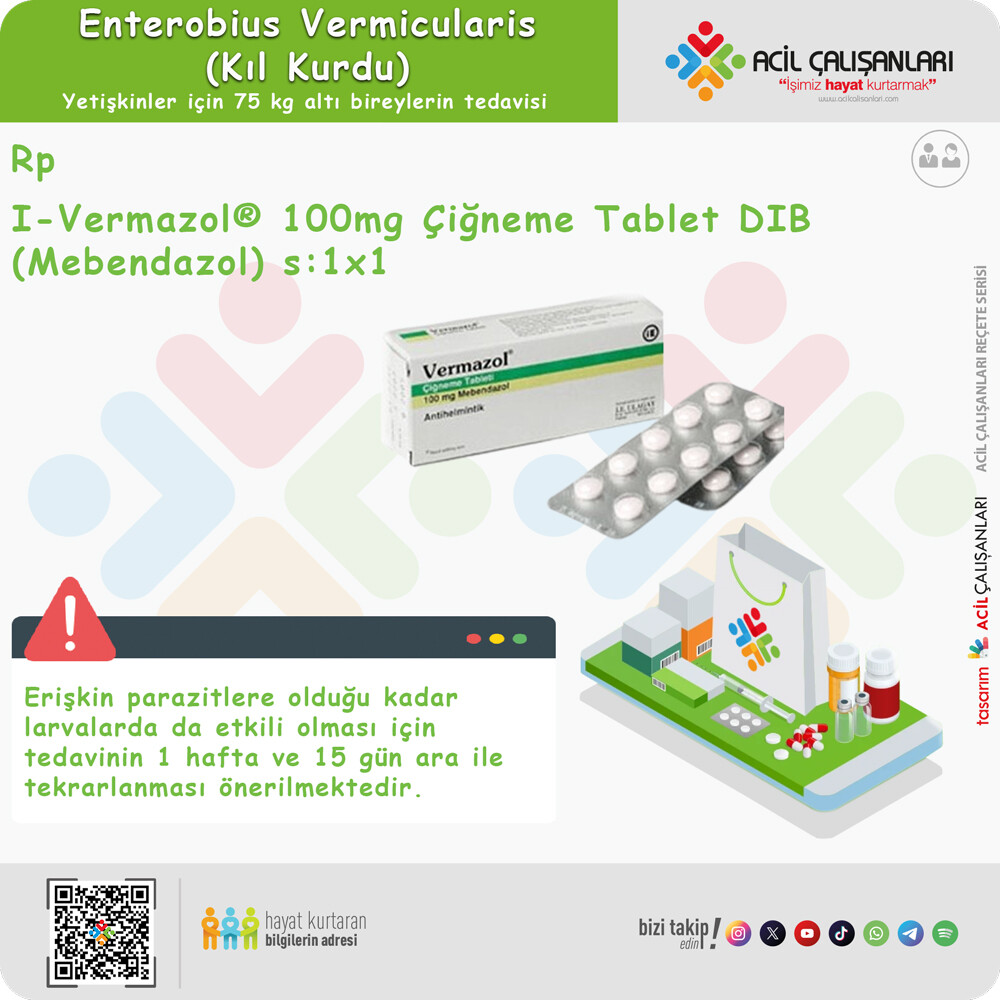 Mebendazol (VERMAZOL®): 100 mg, tek seferlik bir doz, ardından 2 haftada bir tekrar dozu uygulanır.