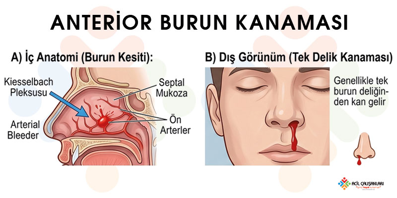 Burun kanamalı hastaların %90’ını oluşturur. Kanamanın kaynağı, ön nazal septumdaki Kiesselbach pleksusu (Little alanı olarak da bilinir) adı verilen damar ağı içindedir ve rinoskopi ile görülebilir. Bu bölgedeki septum üzerindeki mukoza özellikle incedir; bu yüzden aşırı sıcağa ve soğuğa, yüksek ve düşük neme maruz kalındığında kolayca travmatize olur ve kanar.