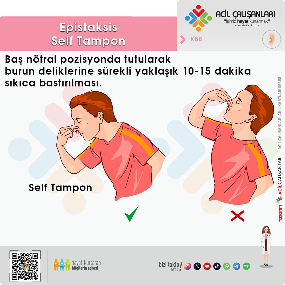 - Hastayı oturt, başı öne eğ, burun kanatlarına bası uygula (self tampon).