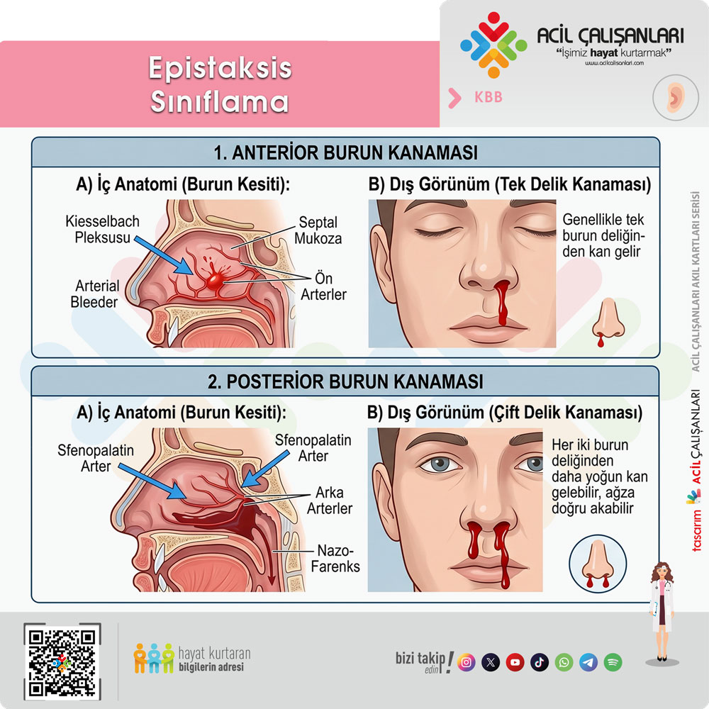 Epistaksis farklı şekillerde sınıflandırılabilir. Kanamanın kaynaklandığı anatomik bölgeye göre anterior kanamalar ve posterior kanamalar olmak üzere iki kategoriye ayrılır.