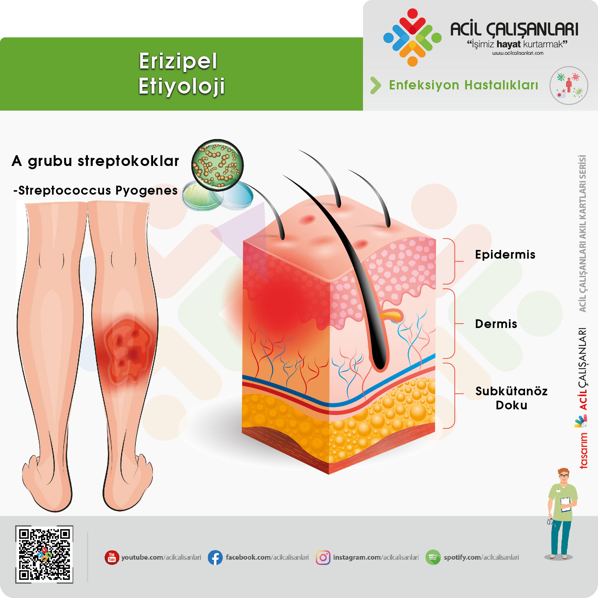 sebep olur. Hastalar yakın zamanda herhangi bir cilt travması veya farenjit açısından sorgulanmalıdır. Genellikle hastalar cilt lezyonunun başlangıcından 48 saat önce halsizlik, ateş ve titreme gibi sistemik semptomlar yaşarlar. Erizipelde, kabarık kenarlarla keskin bir şekilde sınırlandırılmış bir cilt eritem alanı olarak ortaya çıkar. Erizipel titreme ve ateş gibi akut sistemik bulgular ile kendini gösterirken selülit daha yavaş seyirli olarak birkaç günde klinik verir. Çoğu zaman hastalar eritemli bölgede yanma, hassasiyet ve kaşıntıdan şikayet ederler. Şiddetli vakalarda hastalık veziküller, büller ve hatta belirgin nekroz ile ortaya çıkabilir.