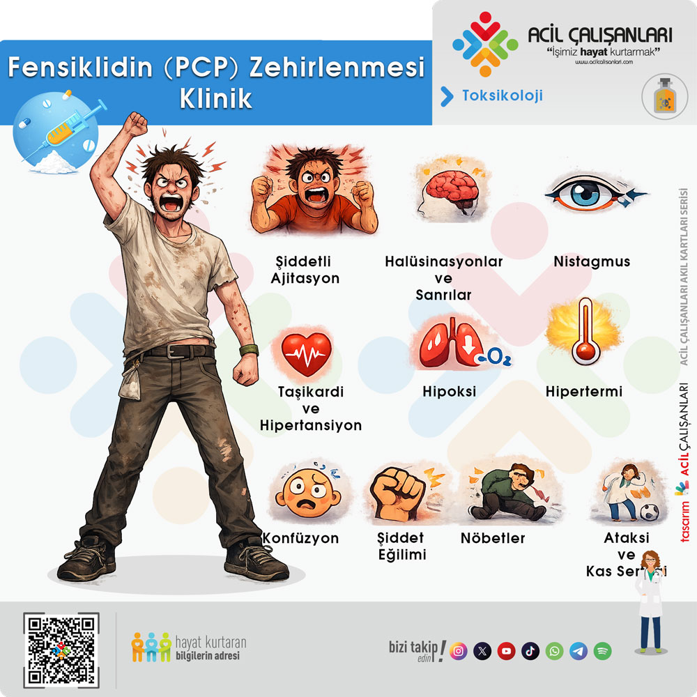 Doza, uygulama yoluna ve yardımcı maddelere bağlı olarak PCP komadan aşırı ajitasyona veya psikoza kadar geniş bir klinik etki yelpazesine neden olabilir. Çoğu zaman hastalar net bir öykü veremezler; bu nedenle acil sağlık personeli, aile, arkadaşlar ve tanıklardan öykü almaya çalışmalıdır. PCP’nin sokak isimlerine aşina olmak da yardımcı olabilir.