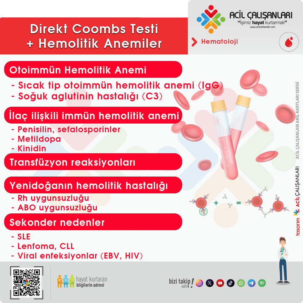 - Direkt Coombs Testi (DAT): İmmün kaynaklı hemolizi (AIHA) ayırmak için kullanılır.