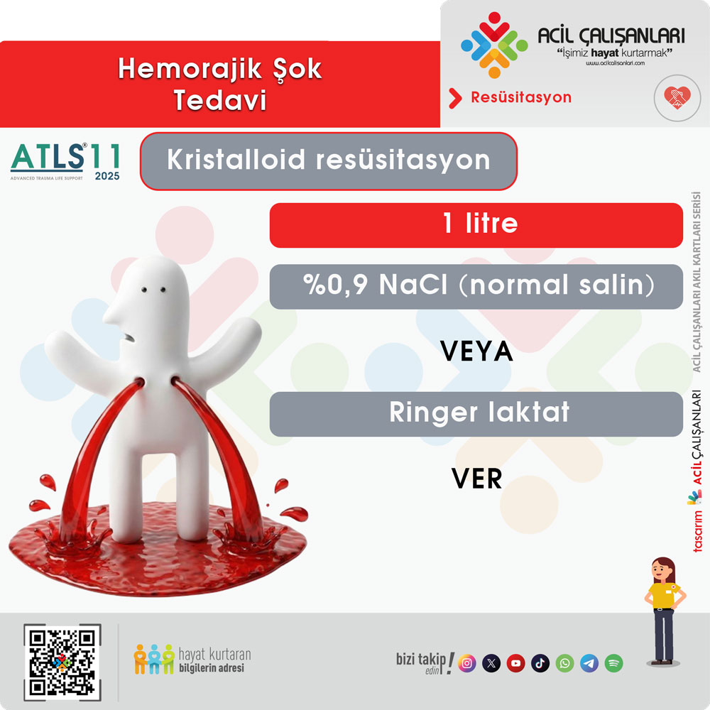 ATLS 11. baskı, ilk yaklaşımda 1 L izotonik kristalloid (örneğin Ringer Laktat veya %0.9 NaCl) uygulanmasını önermektedir. Bu uygulama, hemodinamik yanıtın değerlendirilmesi amacıyla yapılır. Eğer hasta bu sıvı bolusuna olumlu yanıt veriyor ve vital bulguları stabilize oluyorsa, devam eden kanama olasılığı daha düşüktür. Ancak, yanıt kısa süreliyse veya hiç alınamıyorsa, aktif kanama olasılığı yüksektir ve hasta kan ürünü replasmanına yönlendirilmelidir. Kristalloidlerin amacı yalnızca geçici perfüzyon sağlamaktır. Aşırı kristalloid kullanımı, hemodilüsyon, asidoz, koagülopati ve doku ödemi gibi olumsuz etkilere yol açar. Bu nedenle “daha çok sıvı daha iyi” anlayışı artık terk edilmiştir.