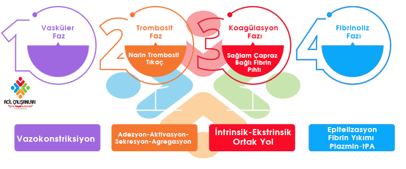 Damarın hasar görmesi ve damar bütünlüğünün bozulması ile ve ağrının oluşması ile sempatik ağrı reseptörlerinin uyarılmasıyla kanamanın durdurabilmesi için ilk vazokonstriksiyon meydana gelir. Vazokonstriksiyonun diğer mediatörleri