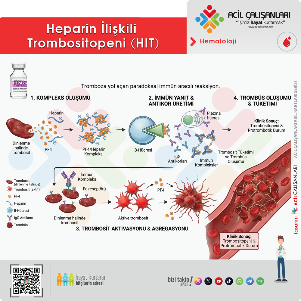 HIT, heparin maruziyetini takiben ortaya çıkan immün aracılı bir durum olup, trombosit sayısında azalma ve paradoksal olarak hiperkoagülabilite ile karakterizedir. Klinik olarak venöz ve arteriyel trombozlara yol açabilen bu tablo, erken tanınmadığı ve uygun şekilde yönetilmediği takdirde yaşamı tehdit edici sonuçlara neden olabilir.