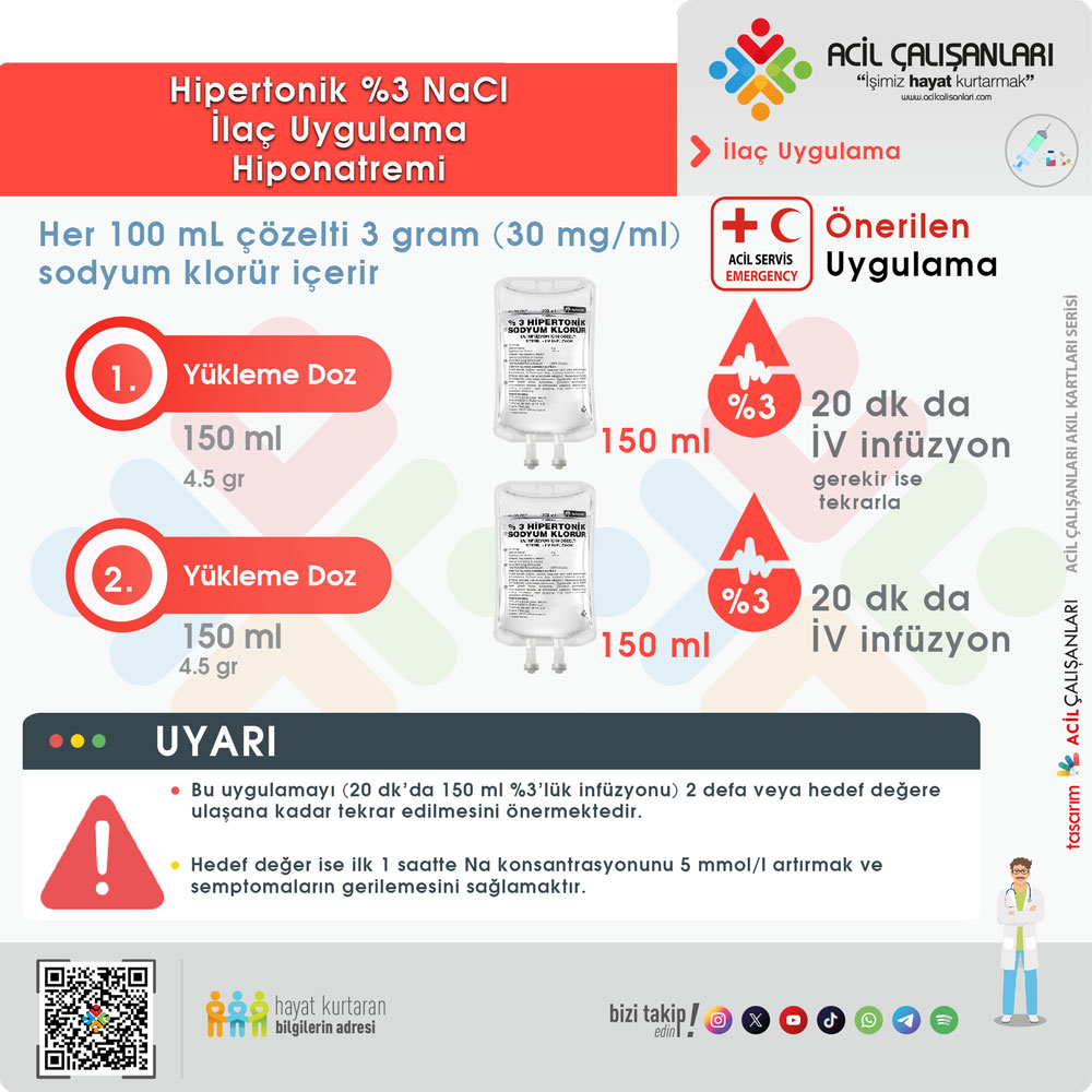 - Şiddetli semptomatik hiponatremi: 150 ml %3’lük hipertonik infüzyonunu yaklaşık 20 dk sürede gidecek şekilde verilmeli. Bu uygulamayı (20 dk’da 150 ml %3’lük infüzyonu) 2 defa veya hedef değere ulaşana kadar tekrar edilmesini önermektedir. Hedef değer ise ilk 1 saatte Na konsantrasyonunu 5 mmol/l artırmak ve semptomaların gerilemesini sağlamaktır. Bu hastaları yakın monitörize edebileceğiniz bir alanda takip edilmesi önerilir.