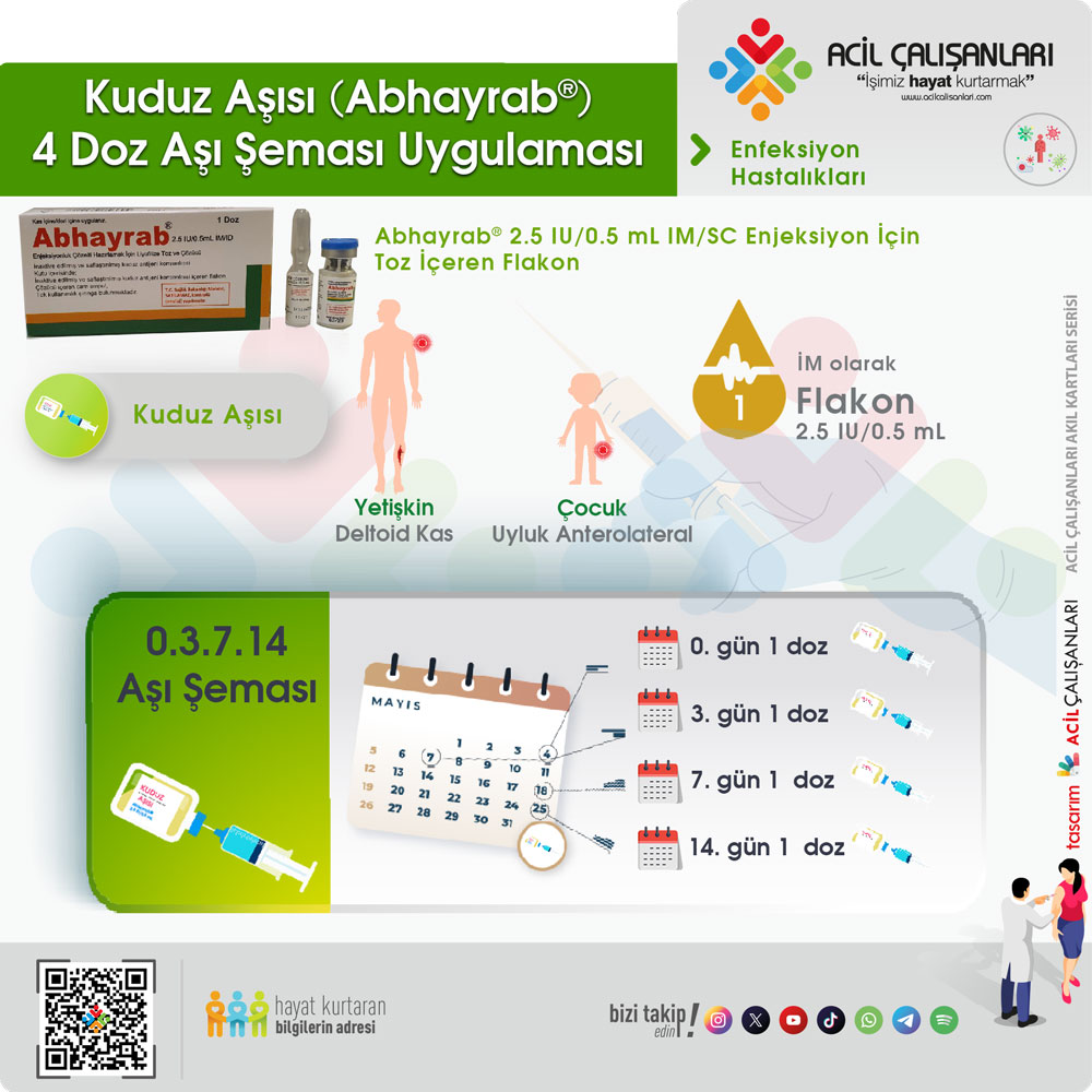Kuduz, çoğunlukla kuduz bir hayvanın ısırması yoluyla bulaşan önlenebilir viral bir hastalıktır. Kuduz, ölümle sonuçlanan bir hastalık olduğundan, korunma yaklaşımları hayat kurtarıcıdır. Bu nedenle, kuduz riski olan hayvanlarla sık temas eden kişilere temas öncesi profilaksi, kuduz riskli teması olan herkese temas sonrası profilaksi uygulanmalıdır. Erken ve önerilere göre uygulanan temas sonrası profilaksi %100 etkindir. Türkiye’de Sağlık Bakanlığı hastanelerinde şu an Abhayrab® isminde kuduz aşısı bulunmaktadır. Yazımıza katkılarından dolayı Hemşire Ayşe Baytaroğlu’na teşekkür ederiz.