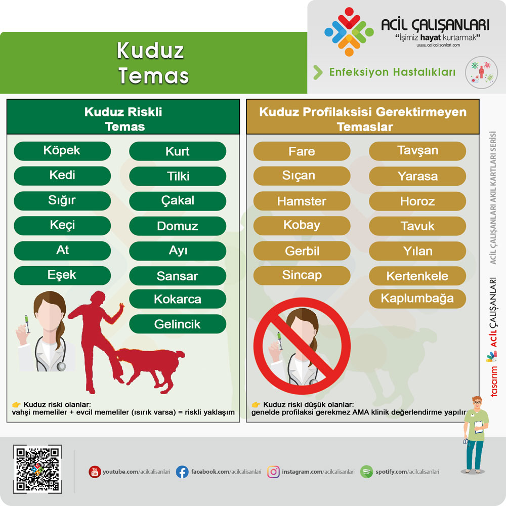 Bu konuda ülkemizde sağlık bakanlığı tarafından yayınlanan ve dönem dönem güncellenen profilaksi algoritmasına uyulması gerekmektedir. Kuduz Riskli Temas algoritması akıl kartına buradan ulaşabilirsiniz
