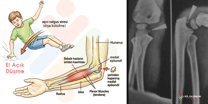 Valgus stres altında medial epikondil apofizi, epifizden kopma tarzında ayrılır.