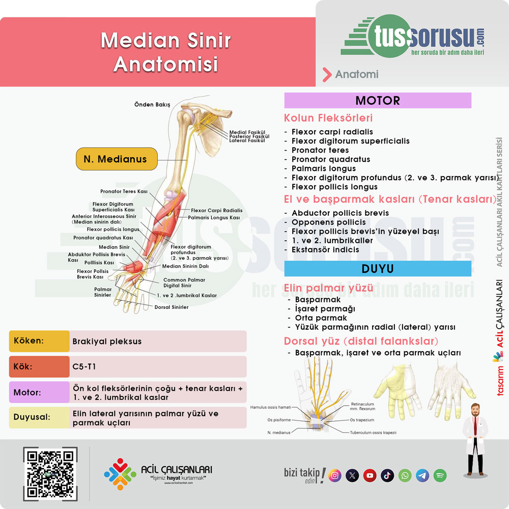 N. medianus (median sinir) brakiyal pleksusun lateral ve medial kordlarından köken alır (C5–T1). Kol boyunca a. brachialis’e eşlik ederek seyreder; dirsek bölgesinde kubital fossadan geçip bicipital aponevrozun (lacertus fibrosus) altından ön kola girer. Ön kolda pronator teres kasının iki başı arasından geçerken n. interosseus anterior (AIN) dalını verir. Ardından m. flexor digitorum superficialis (FDS) ve m. flexor digitorum profundus (FDP) arasında ilerleyerek el bileği düzeyinde karpal tünel içinden ele ulaşır. Median sinir, motor olarak ön kolun çoğu fleksör kasını ve elin önemli bazı intrensek kaslarını innerve eder: ön kolda pronator teres, m. flexor carpi radialis, m. palmaris longus, FDS; AIN dalı ile FDP’nin radyal yarısı (II–III. parmaklar), m. flexor pollicis longus (FPL) ve m. pronator quadratus; elde ise thenar kasları (m. abductor pollicis brevis, m. opponens pollicis, m. flexor pollicis brevis’in yüzeyel başı) ve 1. ile 2. lumbrikalleri uyarır. Median sinirin duyusal dağılımı, el ayasının radyal yarısını ve başparmak, işaret, orta ve yüzük parmaklarının radial yarısını (palmar yüzlerde ilk 3½ parmak) içerir. Ayrıca bu parmakların dorsalinde distal falankslara kadar duyuyu taşır. Bu geniş inovasyon alanı nedeniyle median sinire klinikte “el gözü” de denir.