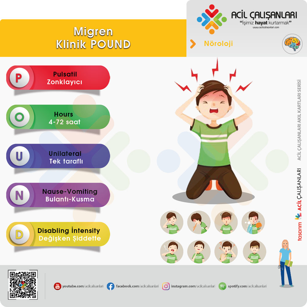 Migrenler, fotofobi ve mide bulantısı ile ilişkili tekrarlayan, tek taraflı, zonklayan baş ağrısı ile karakterizedir. Teşhis klinik olarak konur. POUND gibi anımsatıcılar bizlere yardımcı olabilir.