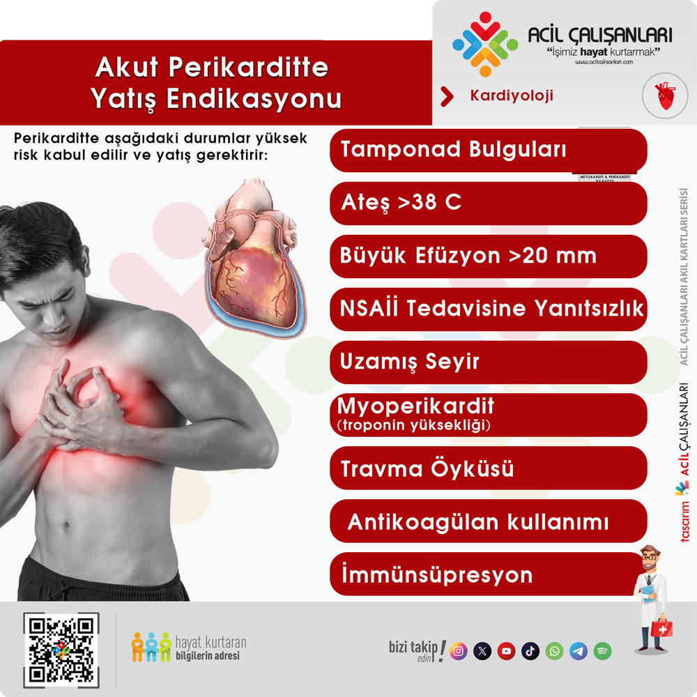 Perikarditte yüksek risk hastane yatışı izlem ve tedavi için önerilir. Aynı zamanda prognostik belirteçlerden biri veya daha fazlası varsa hastanın yatırılmasını ve etiyoloji araştırmasının yapılmasını açıkça vurgular. Bu pratikte; tamponad / büyük efüzyon, ateş, NSAİİ’ye yanıtsızlık, effüzif-konstriktif tablo veya “incessant” seyir gibi durumlarda taburculuk yerine yatış çizgisine geçmek anlamına gelir.