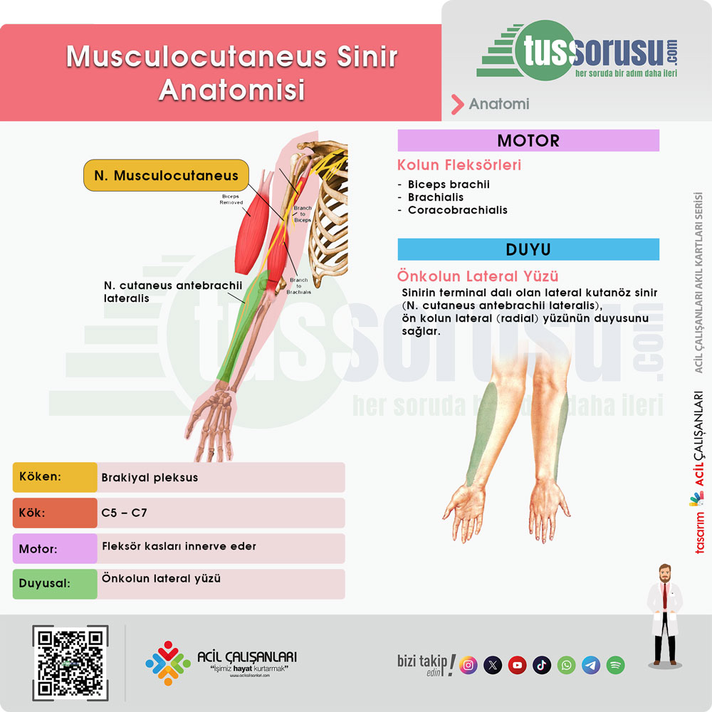 Kök ve orijin: N. musculocutaneus, brakiyal pleksusun lateral kordundan (C5–C7) çıkar.