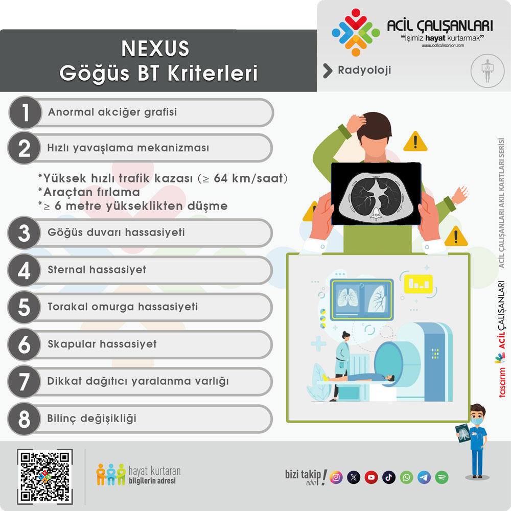 NEXUS Göğüs BT kriterleri, künt toraks travması olan hastalarda göğüs BT çekimine gerek olup olmadığını belirlemek amacıyla geliştirilmiştir. Amaç; gereksiz BT’leri azaltırken, klinik olarak anlamlı torasik yaralanmaları atlamamaktır.