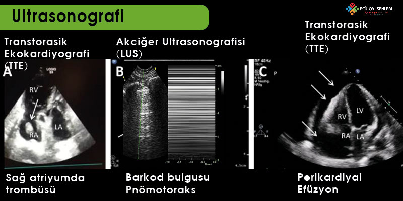 - Akciğer USG: Akciğer kaymasının (sliding) kaybı ve lung point varlığı tansiyon pnömotoraksı gösterir.