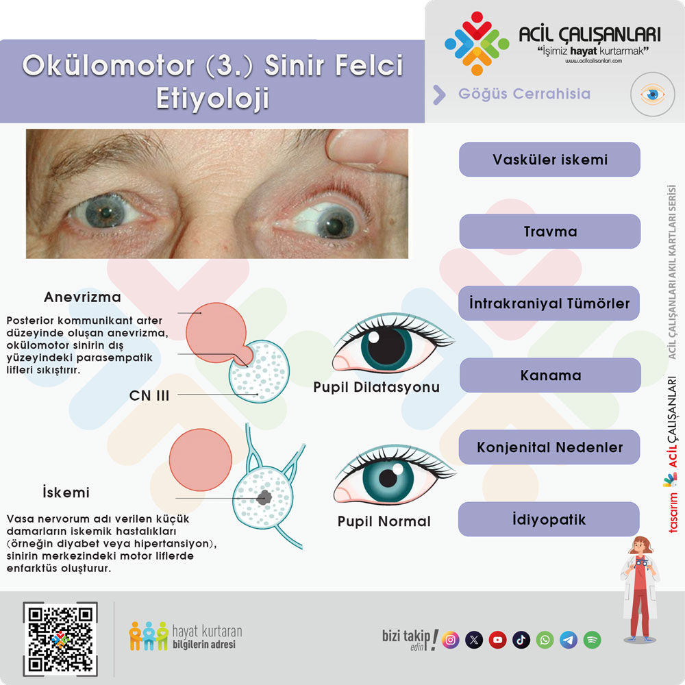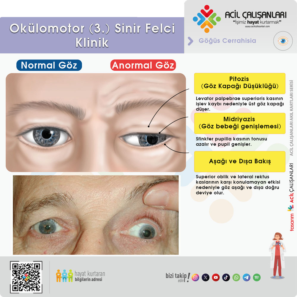 Okülomotor sinir felci (CN III palsisi), göz hareketlerinde kısıtlılık, pitozis (göz kapağı düşüklüğü) ve pupilla dilatasyonu gibi belirgin klinik bulgularla kendini gösterebilir. Bu tablo, basit mikrovasküler nedenlerden (örneğin diyabetik nöropati) anevrizma veya kafa içi kitle gibi hayatı tehdit eden patolojilere kadar geniş bir etiyolojik yelpazeye sahiptir.