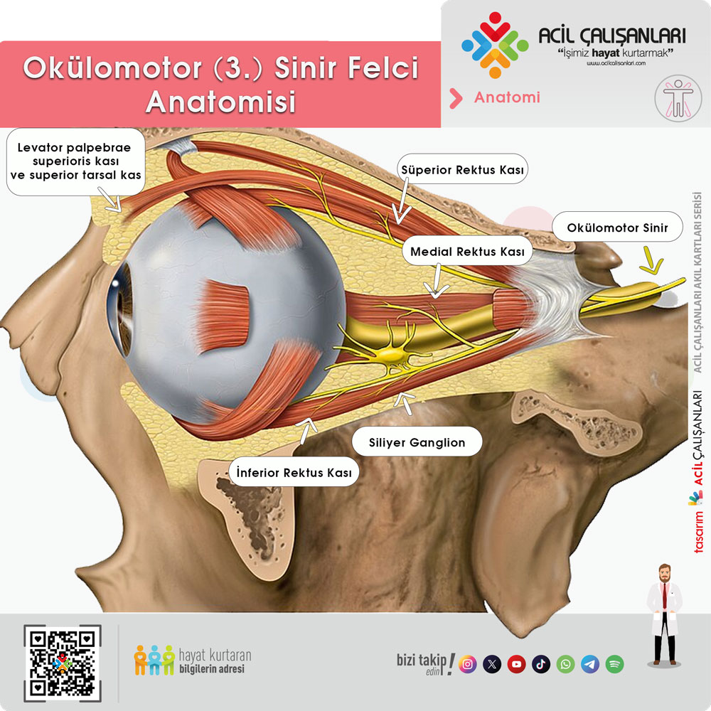 Üçüncü kranial sinir (n. oculomotorius), göz hareketlerinin büyük çoğunluğundan, pupilla refleksinden ve göz kapağının kaldırılmasından sorumlu olan karma bir motor sinirdir. Parasempatik ve somatik liflerden oluşan bu sinir, göz küresinin hassas koordinasyonunda kritik bir rol oynar. Parasempatik lifleri silier kas ve sfinkter pupilla kasını, somatik motor lifleri ise levator palpebrae superioris ile dört dış oküler kası (superior, medial, inferior rektuslar ve inferior oblik) innerve eder.