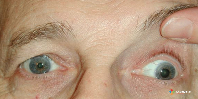 Normal göz ve anormal göz karşılaştırıldığında, okülomotor sinir felci olan gözde tipik üç bulgu görülür: