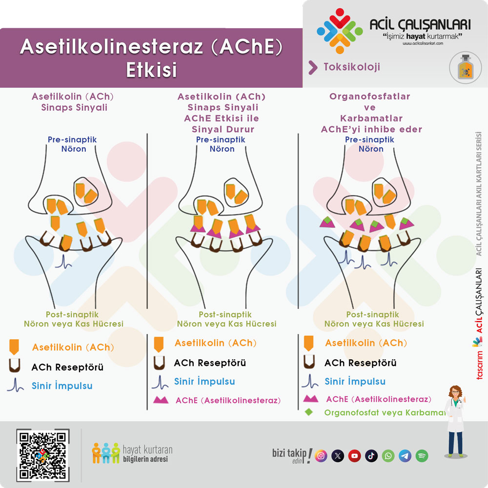 Kolinesterazın inhibisyonu (organofosfatlar, karbamatlar), sinir sinapslarında ve nöromusküler kavşaklarda asetilkolinin artmasına neden olarak asetilkolin reseptörlerinin aşırı stimülasyonuna yol açar. Bu aşırı stimülasyonun başlangıcında, merkezi sinir sistemi (MSS), otonomik gangliyonlar, parasempatik ve bazı sempatik sinir uçları ve somatik sinirlerde yaygın bir kolinerjik sinaptik paralizi izler.