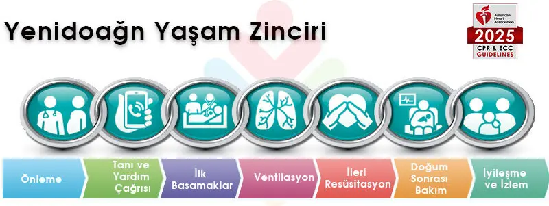 Neonatal resüsitasyon, 2020 AHA kılavuzlarına uygun olarak uygulanmalıdır (bkz. Görsel: Neonatal Resüsitasyon Algoritması). AHA ve AAP tarafından 2023’te yayımlanan güncellemeler, kordon klempleme zamanlaması, pozitif basınçlı ventilasyon (PPV) yöntemleri ve hava yolu araçlarının seçiminin neonatal sonuçlar üzerindeki etkisini gösteren yeni kanıtlara dayanmaktadır.