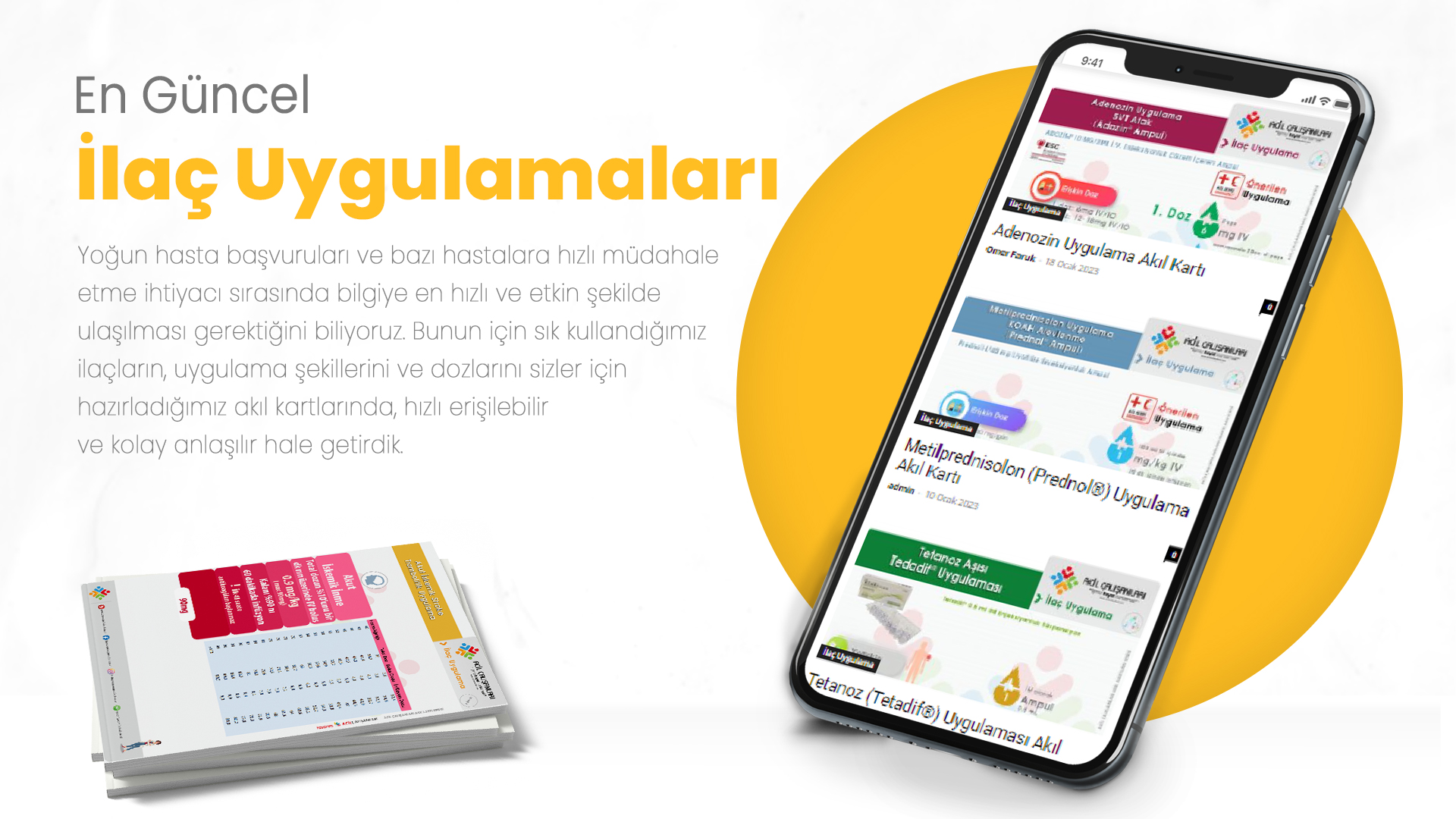 Yoğun hasta başvuruları ve bazı hastalara hızlı müdahale etme ihtiyacı sırasında bilgiye en hızlı ve etkin şekilde ulaşılması gerektiğini biliyoruz. Bunun için acil serviste sık kullandığımız ilaçların, uygulama şekillerini ve dozlarını sizler için hazırladığımız akıl kartlarında, hızlı erişilebilir ve kolay anlaşılır hale getirdik.