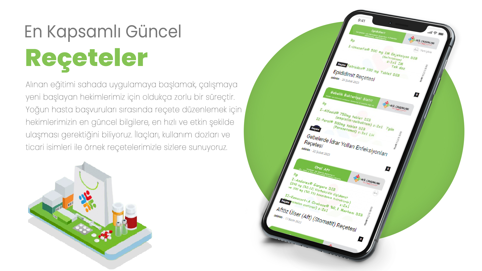 Alınan eğitimi sahada uygulamaya başlamak, çalışmaya yeni başlayan hekimlerimiz için oldukça zorlu bir süreçtir. Yoğun hasta başvuruları sırasında reçete düzenlemek için hekimlerimizin en güncel bilgilere, en hızlı ve etkin şekilde ulaşması gerektiğini biliyoruz. İlaçları, kullanım dozları ve ticari isimleri ile örnek reçetelerimizle sizlere sunuyoruz.