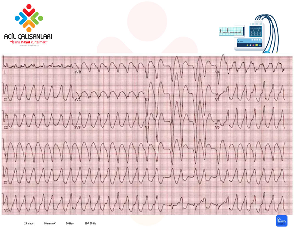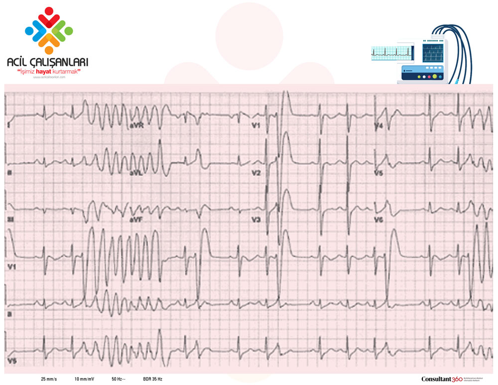 Bu EKG, acil tıbbın en kritik ritimlerinden birini göstermektedir. Doğru tanıyı koymak için EKG’nin sistematik bir şekilde değerlendirilmesi gerekir.